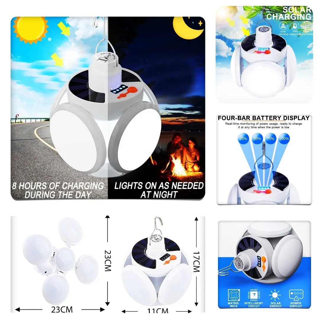 ❌️یک چراغ با کیفیت با 5 حالت نوردهی میباشد که از یک لامپ در پایین و 4 عدد لامپ کناری تاشو تشکیل شده است.
